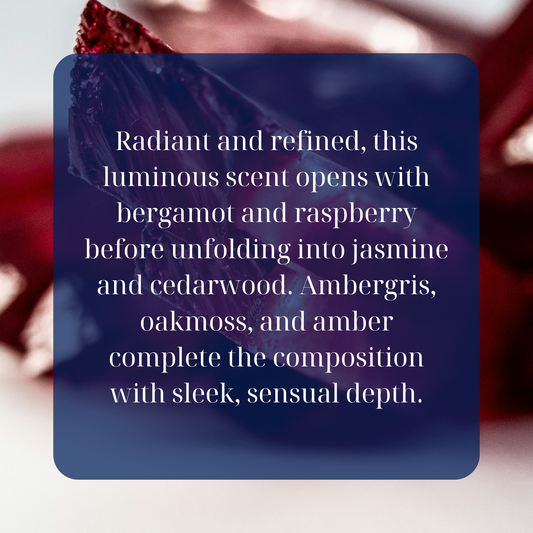 Radiant and refined, this luminous scent opens with bergamot and raspberry before unfolding into jasmine and cedarwood. Ambergris, oakmoss, and amber complete the composition with sleek, sensual depth.
