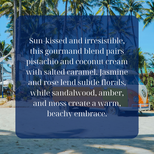 Sun-kissed and irresistible, this gourmand blend pairs pistachio and coconut cream with salted caramel. Jasmine and rose lend subtle florals, while sandalwood, amber, and moss create a warm, beachy embrace.