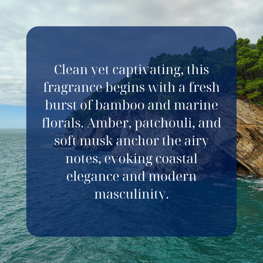 Clean yet captivating, this fragrance begins with a fresh burst of bamboo and marine florals. Amber, patchouli, and soft musk anchor the airy notes, evoking coastal elegance and modern masculinity.