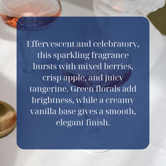 Effervescent and celebratory, this sparkling fragrance bursts with mixed berries, crisp apple, and juicy tangerine. Green florals add brightness, while a creamy vanilla base gives a smooth, elegant finish.
