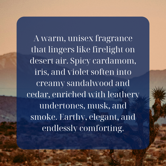 A warm, unisex fragrance that lingers like firelight on desert air. Spicy cardamom, iris, and violet soften into creamy sandalwood and cedar, enriched with leathery undertones, musk, and smoke. Earthy, elegant, and endlessly comforting.