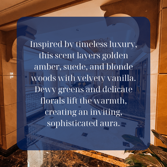 Inspired by timeless luxury, this scent layers golden amber, suede, and blonde woods with velvety vanilla. Dewy greens and delicate florals lift the warmth, creating an inviting, sophisticated aura.